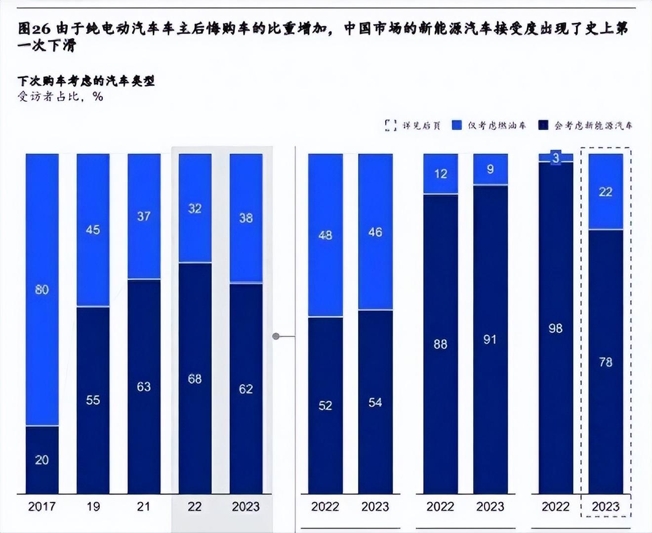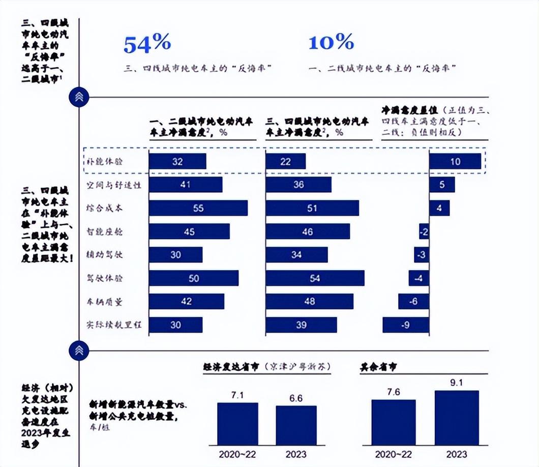 ?報告提煉:純電動汽車車主群體中,有高達22%的車主表示在下次購車時將不再考慮新能源汽車,這一比例相較于2022年的3%顯著增長。特別值得注意的是,三、四線城市電動汽車車主的“反悔率”竟高達54%,這一數字遠超一、二線城市車主的10%,從而顯著推高了整體“反悔率”在2023年的增長幅度。