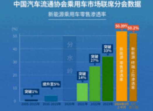 根據乘聯會和中國汽車流通協會發布的數據顯示,繼4月前兩周我國新能源汽車的零售滲透率超過50%之后,5月第三周的新能源車型終端上險滲透率也突破50%,達到了50.2%,首次超過燃油車,這將會是汽車工業歷史的一個轉折點。