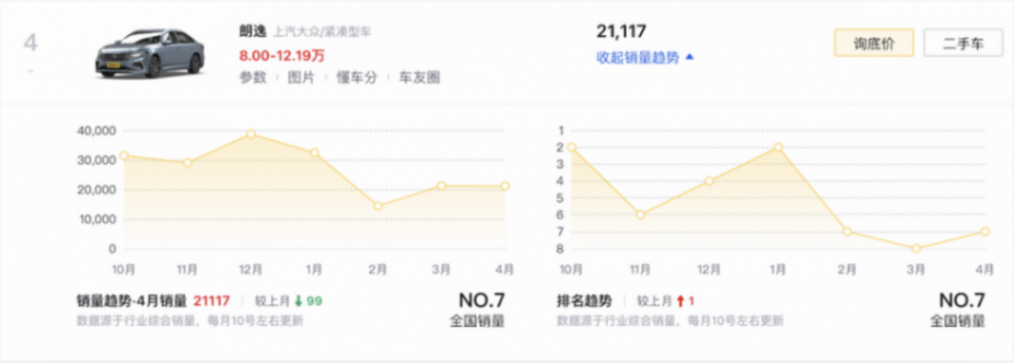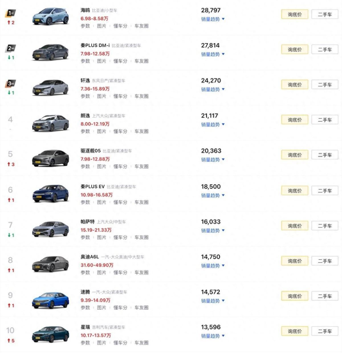 而作為轎車市場的“傳統冠軍”,日產軒逸(10.86-17.49萬元)與大眾朗逸(8.00-15.19萬元)被比亞迪擠到了第三名、第四名的位置,兩款車型雖然都實現了單月銷量破萬,但均遭遇了不同銷量下滑,其中,日產軒逸月銷量較上月更是少了5400多輛,在日產不斷推新,還給出了更接近于新能源的汽油電驅版、更低價位的經典版,但依舊難以阻止國產新能源的沖擊。