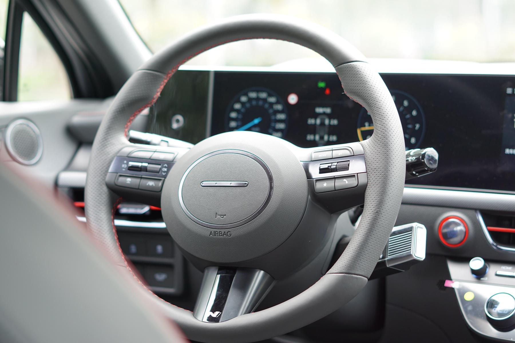 內飾方面也有些變動,這臺實拍的N Line版本車型采用的是碳纖維紋理飾板,紅色縫線強調運動氛圍。全新的三輻式方向盤更好抓握,并且方向盤的LOGO竟然是采用了摩斯密碼理念的H,你發現了嗎?另外換擋機構變更為旋轉式電子懷擋,并且雙連屏呈現曲面效果,方便駕駛員操作??照{面板和多媒體控制區域增加旋鈕按鍵,方便開車過程中盲操,人性化的設計值得一個好評。