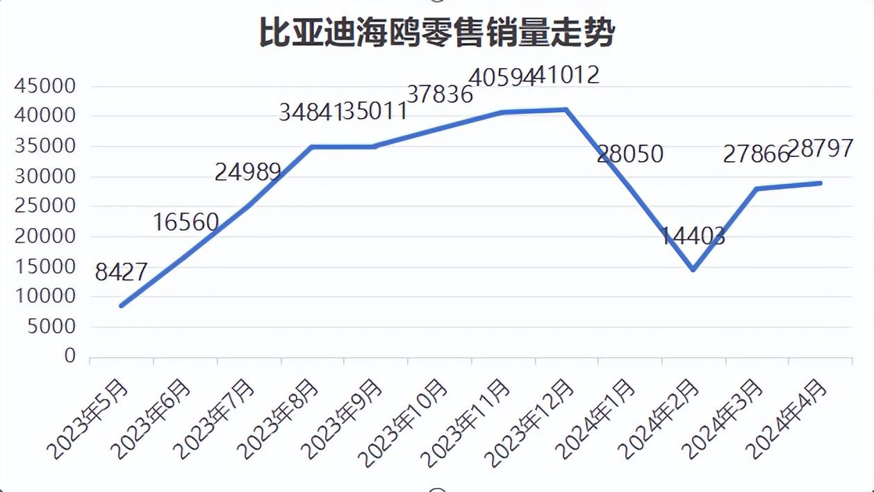比亞迪海鷗在2023年4月正式上市,這一車型是2023年A0級市場中僅次于海豚的產(chǎn)品。該車上市后銷量一路增長,進入穩(wěn)定期后其零售銷量一直保持在3.5萬輛以上,到年底,單月零售銷量破4萬;今年1-4月,除2月份之外,其余三個月,比亞迪海鷗零售銷量穩(wěn)定在2.8萬輛上下。