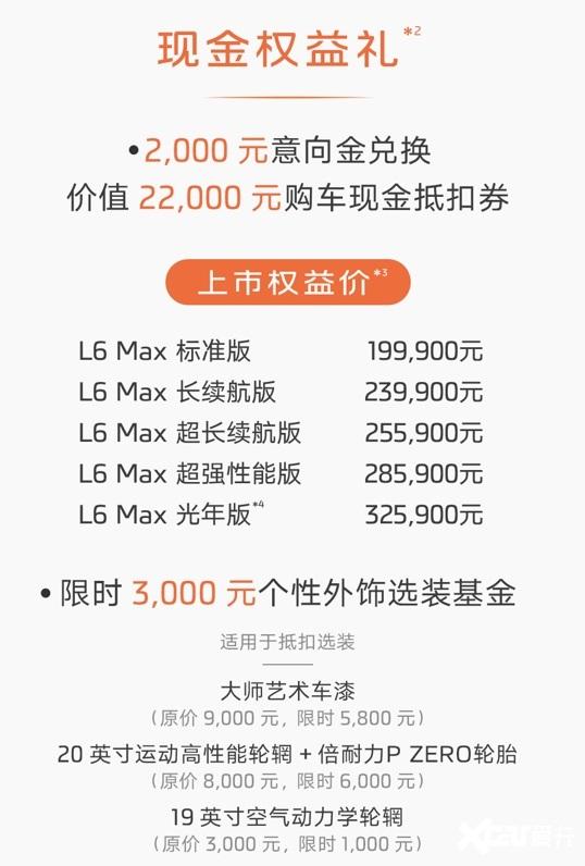 再看智己L6,其上市不但給出了2000元意向金兌換價值22000元的購車現金抵扣券,直接來了個20000元的現金優惠,而且針對不同配置版本車型,還提供了限時3999元升級價值22000元的豪華配置包。