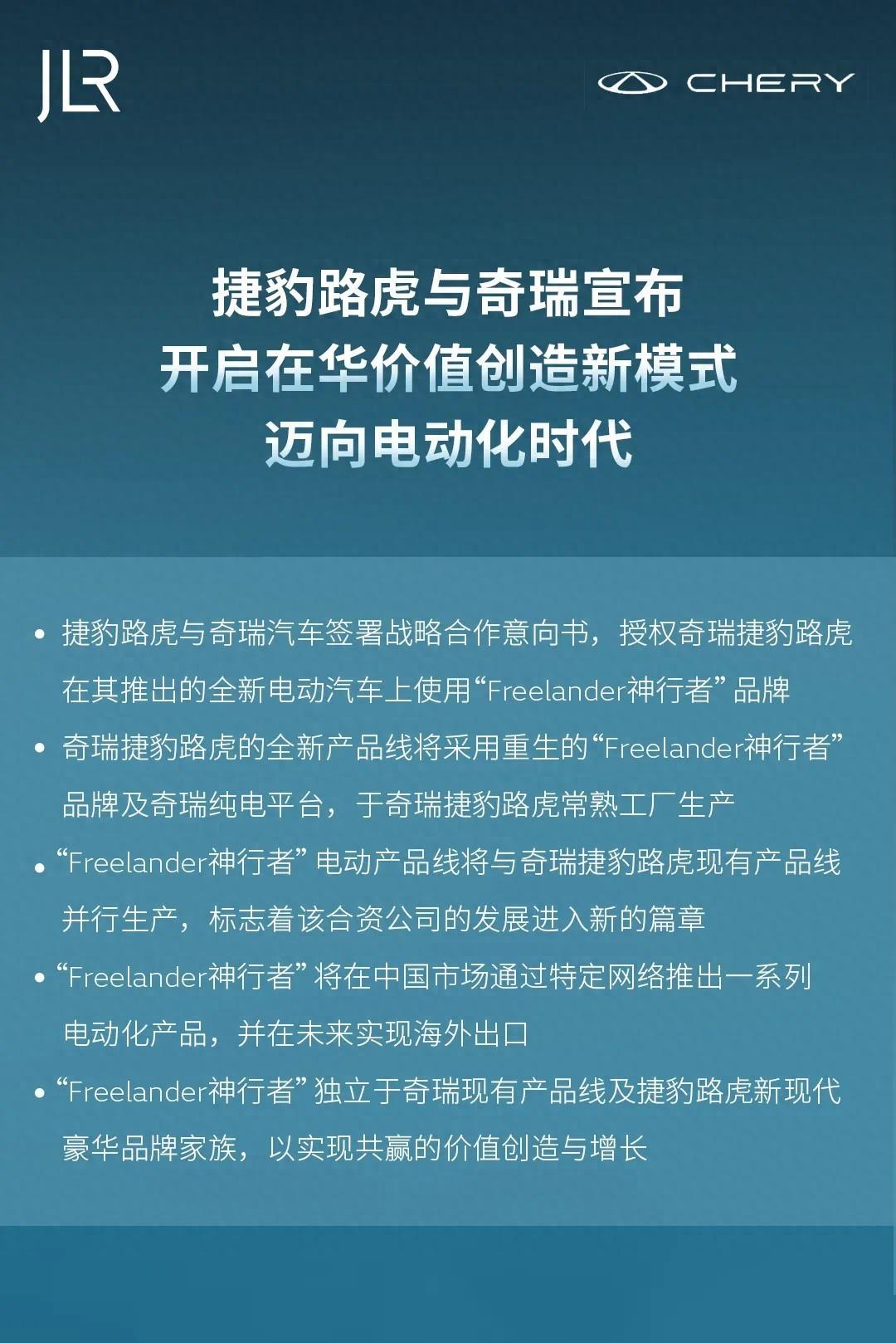 1、授權(quán)奇瑞捷豹路虎在全新電動(dòng)車(chē)產(chǎn)品上使用“Freelander神行者”品牌;