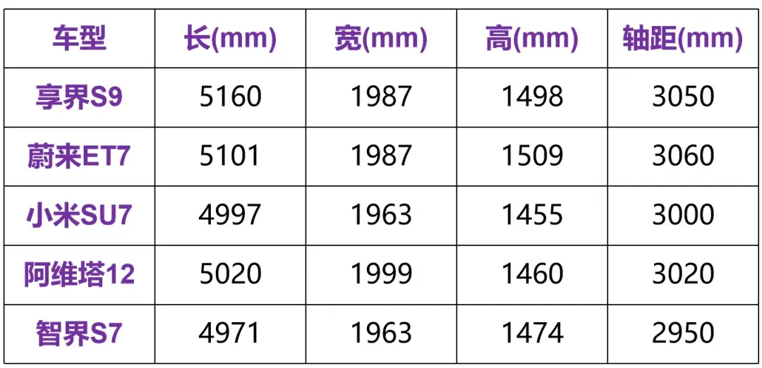 首先從定位來講,享界S9是一臺C級中大型轎車,這在純電動轎車領域已經很普遍了,例如蔚來ET7、小米SU7、阿維塔12、智己L7,以及鴻蒙智行自家的智界S7,都是C級車的定位。