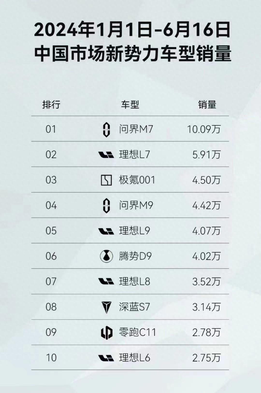 最近,國產(chǎn)中高端新能源車型,今年1月1日-6月16日的銷量匯總曝光,涉及蔚小理等新勢力,極氪、深藍(lán)、騰勢等“創(chuàng)二代”,及華為跨界賦能的問界等品牌車型,榜單的前十名,還是相當(dāng)有看點(diǎn)的。