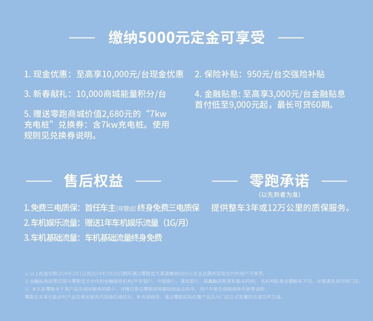 據悉,凡在2月份活動期間購買零跑T03的用戶,可享最高可補貼10000元,補貼后四款在售車型的售價區間為4.99萬-7.99萬元,除此之外,官方還為全系車型贈送交強險,提供新春大禮包10000商城積分等福利。