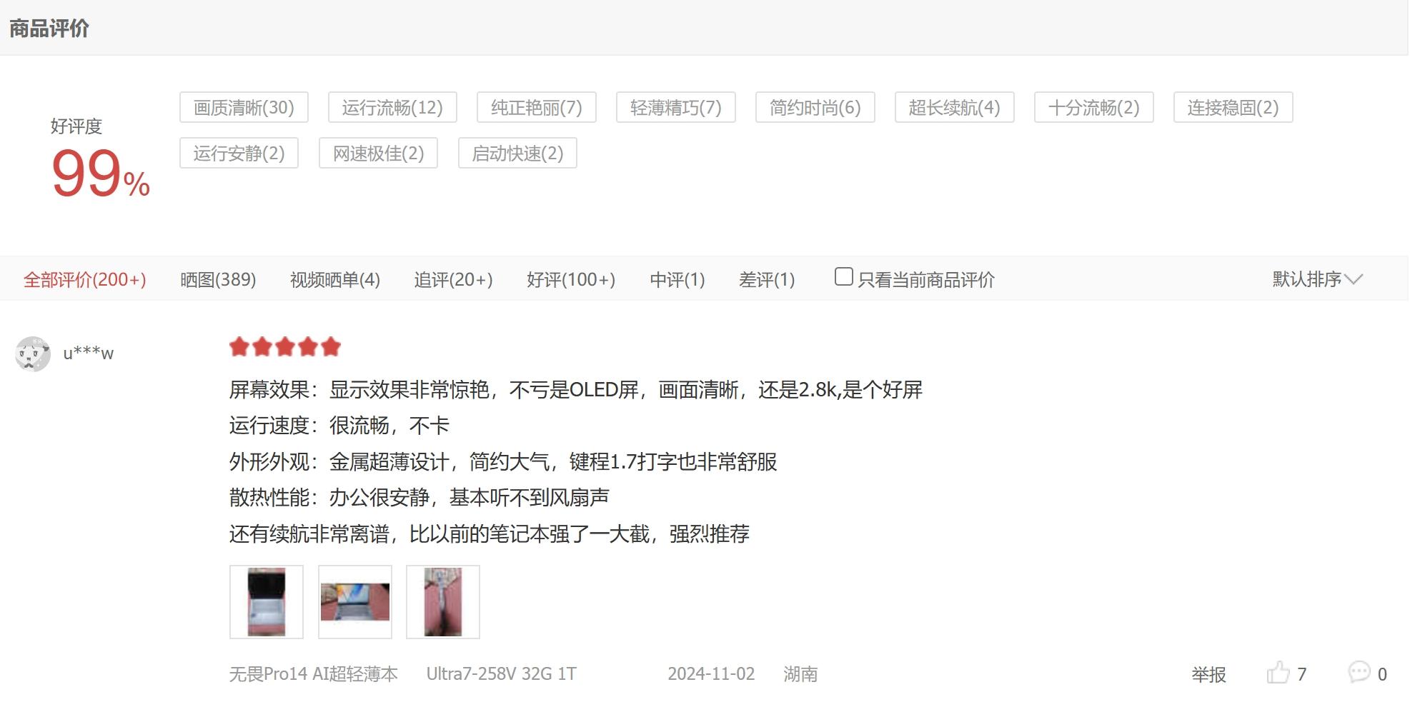 很多用戶上手之后,在電商平臺上留下了自己的真實評價。在京東,華碩無畏Pro14的好評率高達99%,很多人對它的輕薄度、性能、屏幕和續航等表現給出盛贊,認為“金屬超薄設計”、“顯示效果非常驚艷”、“很流暢”、“續航非常離譜”。