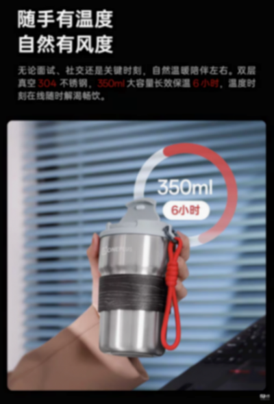 據介紹,這款隨行杯外覆“自然原木質感”防滑杯套,底部使用硅膠設計,配備可拆卸提繩,采用 304 不銹鋼內膽,整體容量 350 毫升,號稱可以長效保溫 6 小時。