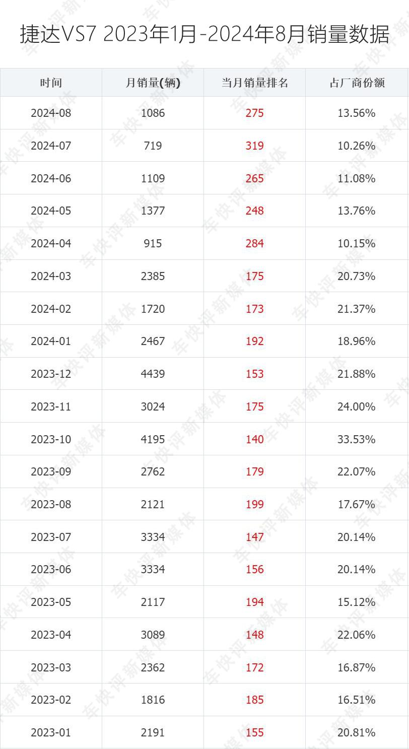 也就是說,捷達VS7是捷達品牌銷量最差的車型。今年4~8月,捷達VS7已經連續5個月單月銷量都沒有突破2000輛以上了。