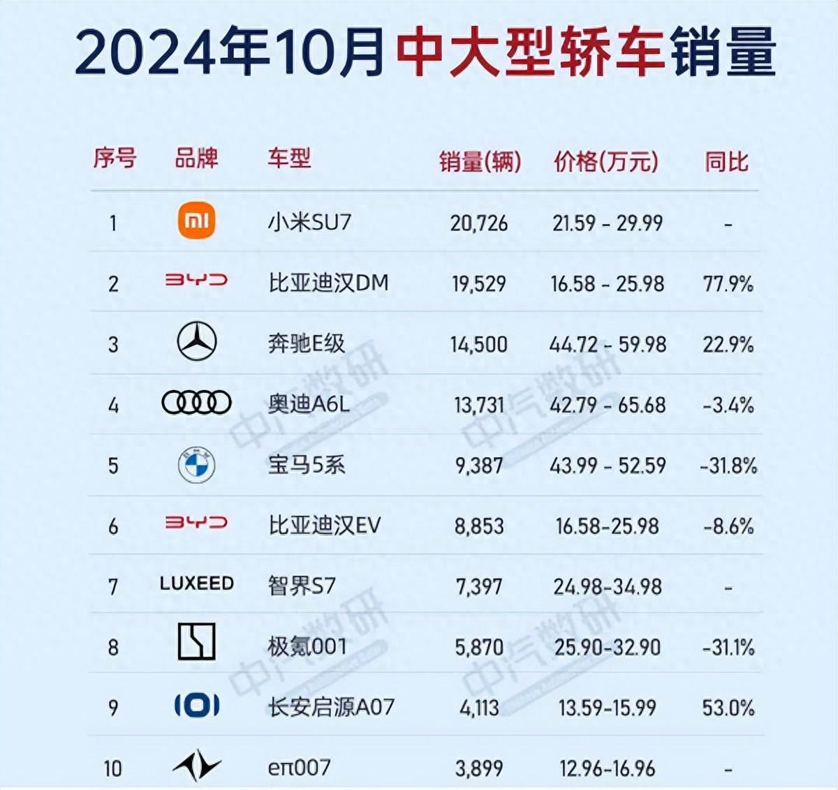 中汽數(shù)研發(fā)布的最新報(bào)告顯示,小米汽車在10月份的銷量表現(xiàn)尤為亮眼,憑借20726輛的佳績(jī),不僅在中大型轎車市場(chǎng)中獨(dú)占鰲頭,還超越了傳統(tǒng)豪華品牌BBA的熱門車型以及比亞迪漢,創(chuàng)下了小米汽車上市后的單月銷量新高。