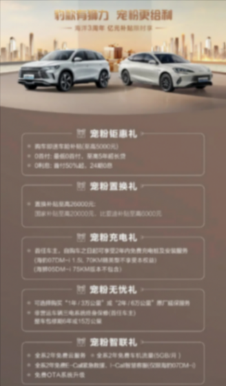 在比亞迪海洋網3周年之際,公司推出了針對海豹07 DM和海獅05 DM車型的億元補貼活動。購車者可享受最高5000元的車險補貼和最高2.6萬元的置換補貼(含國家補貼和比亞迪補貼),同時還有最低0首付至高5年超長貸的金融方案。活動截止至11月30日。