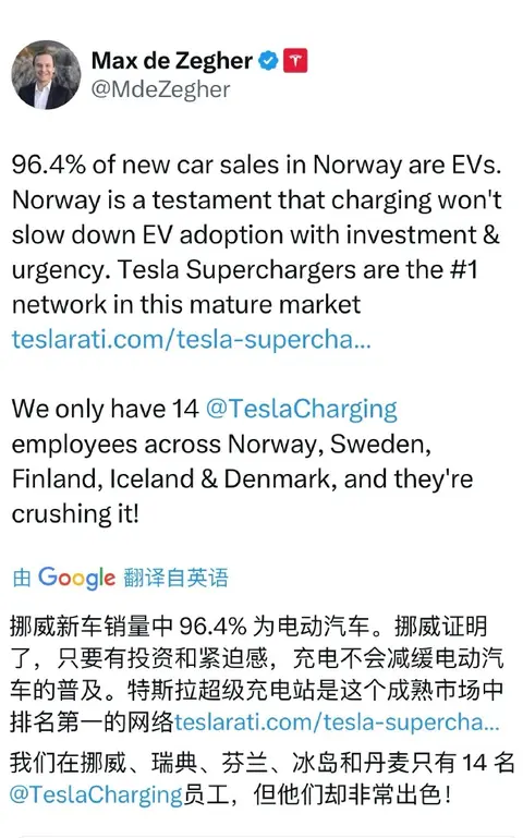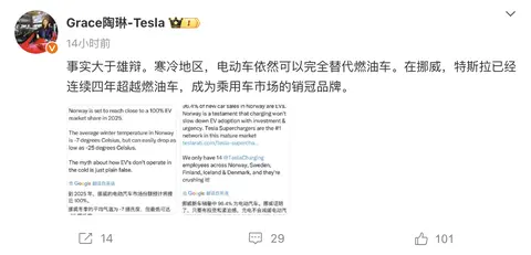 日前,特斯拉副總裁陶琳在社交媒體發文稱:事實大于雄辯。寒冷地區,電動車依然可以完全替代燃油車。在挪威,特斯拉已經連續四年超越燃油車,成為乘用車市場的銷冠品牌。