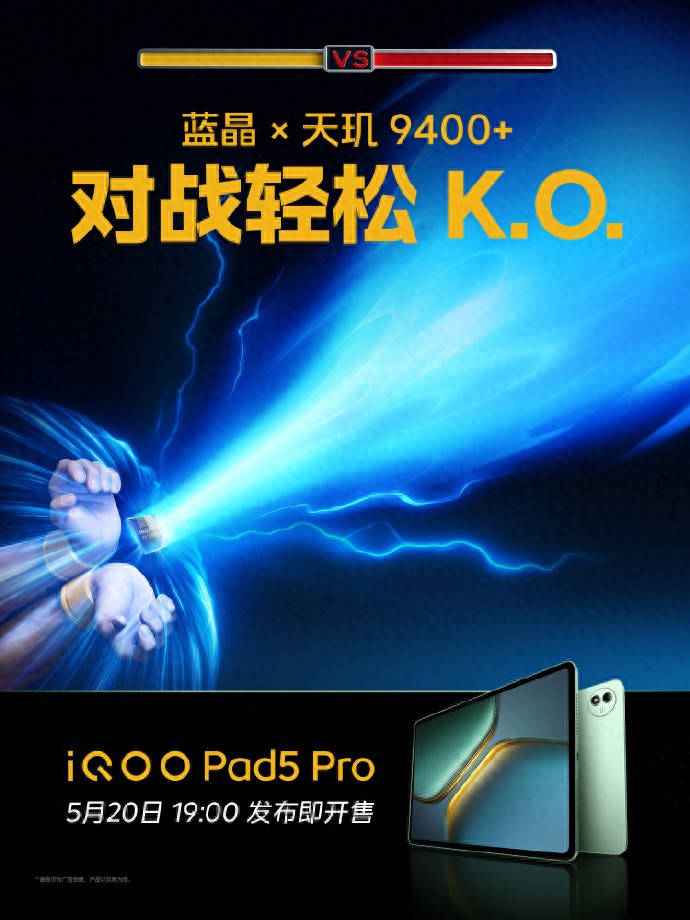 5 月 16 日消息,iQOO Pad5 Pro 平板將于 5 月 20 日 19:00 發布,今日官方預熱顯示,這款新品搭載藍晶 x 天璣 9400+ 處理器、40600mm² 立體散熱系統、12050mAh 電池。