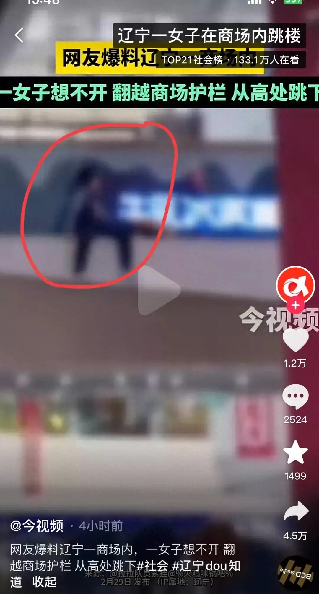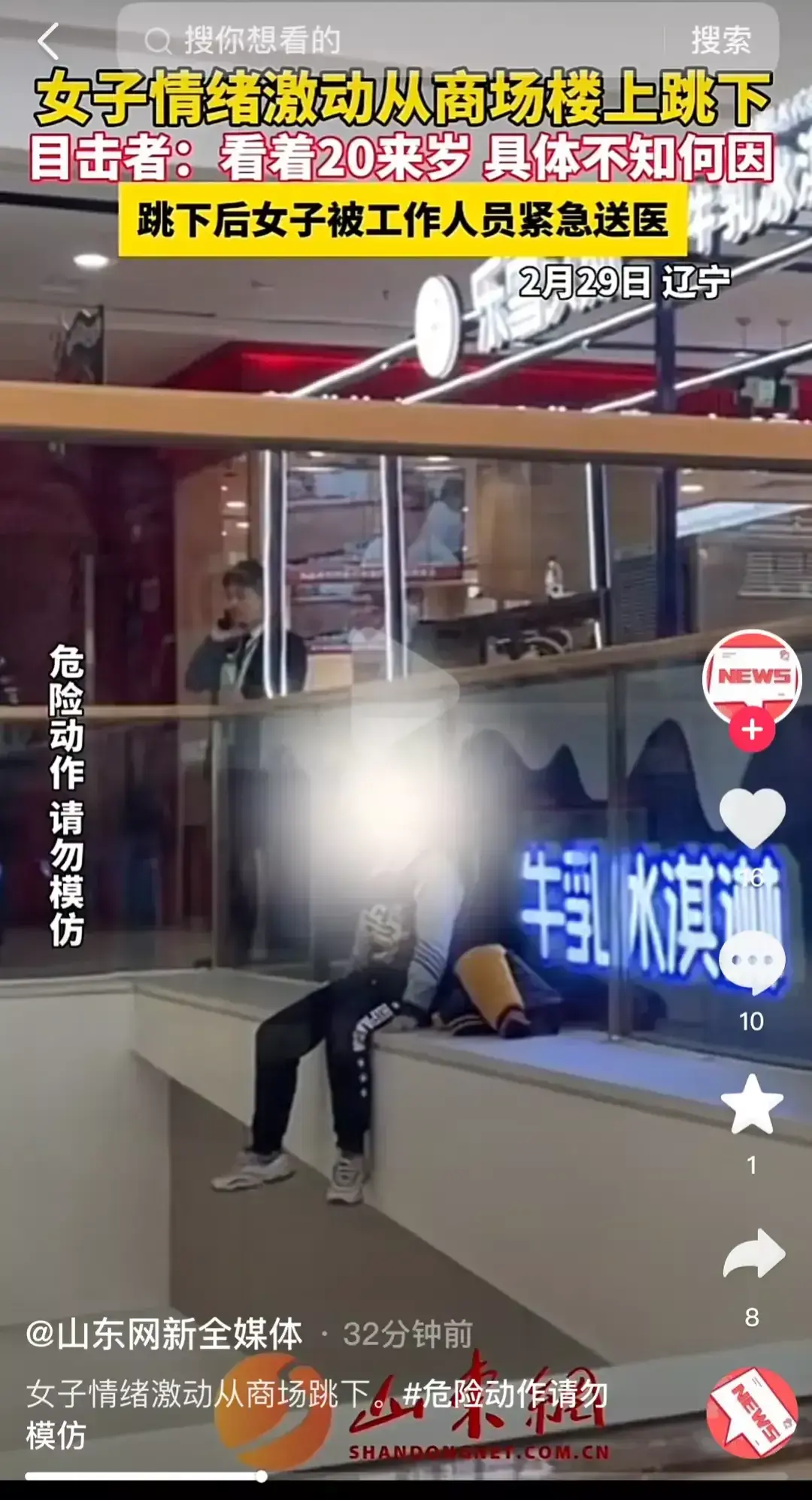 遼寧某商場內,一名女子心生絕念,越過護欄,從高樓飛身而下。