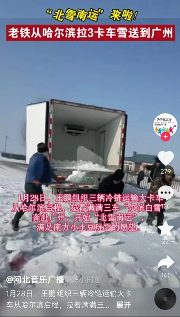哈爾濱市民任先生說,今年東北的冰雪旅游比較火,有很多南方的小土豆來玩的很開心,但是還是有很多南方朋友沒法親自來北方看雪,所以,就想著把這些雪完好無損運到南方,讓南方的朋友也體會到這份冰雪奇緣快樂。