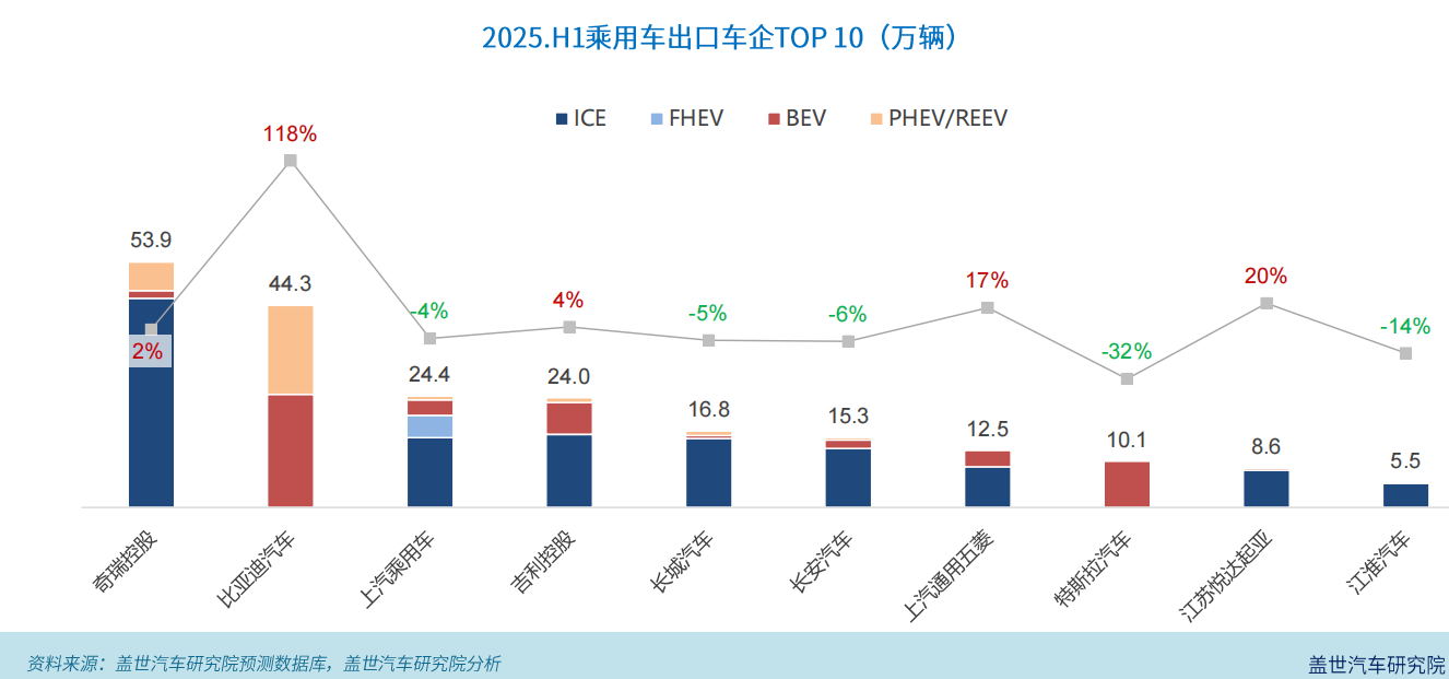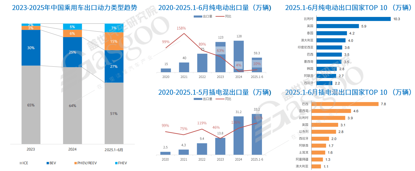 燃油車出口下降伴隨著出口重心加快向新能源轉移。蓋世汽車研究院的數據顯示,今年上半年,中國新能源乘用車的出口占比從2024年的31%上升到42%。其中,純電動乘用車出口59.3萬輛,雖然高于插混車型,但同比增速僅為10%;相比之下,同期插電式混合動力乘用車出口呈現翻倍趨勢,同比增幅高達165%,接替純電動成為新一輪增長引擎。