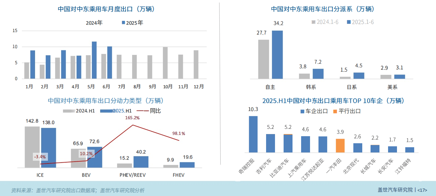 與之形成鮮明對比的,是中東市場的爆發。自主車企依然是中國對中東出口乘用車的基本盤,與此同時,江蘇悅達起亞、北京現代、江鈴福特等合資車企在中國銷量下滑的背景下,也開始將目光投向中東市場,加大對中東出口,旨在使中東成為利用中國產能進行戰略回補的承接地。其中,一汽豐田出現大量經銷商平行出口現象。