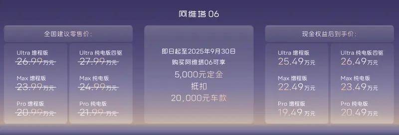 8月29日,阿維塔06 Ultra增程版正式上市,售價26.99萬元,權益后到手價25.49萬元。