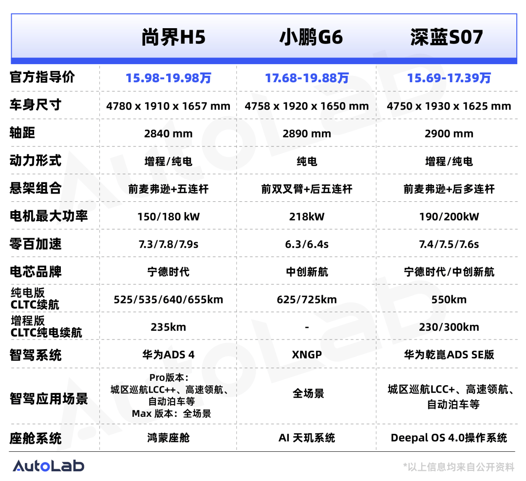 如上圖所示,對比小鵬G6和深藍S07這樣同級別的競品來看,尚界H5的空間表現、動力表現、純電續航表現均不算突出,尤其動力參數上會明顯落后一截。