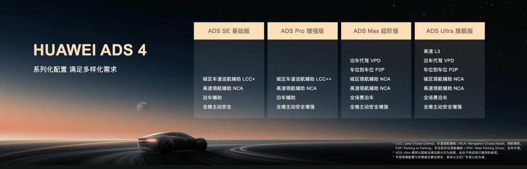 比如同樣是城區車道巡航,華為給ADS Pro的描述是“LCC++”,而ADS SE是“LCC+”;同樣是主動安全,華為給ADS Pro的描述是“全維主動安全增強”,而ADS SE僅是“全維主動安全”。