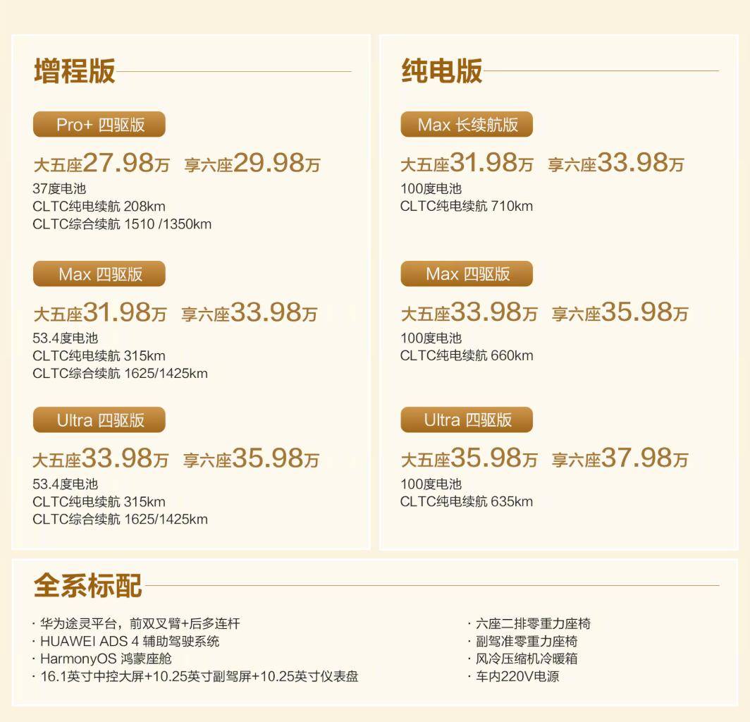 此次全新問界M7共推出Pro+、Max和Ultra三檔車型,涵蓋增程四驅、純電后驅與純電四驅三種動力形式,并提供五座與六座布局,價格區間覆蓋28萬至38萬元,選擇極為豐富。但是簡單來看就是: