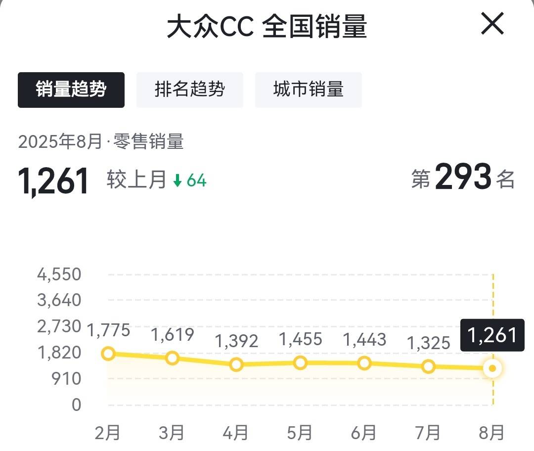 可惜的是,即便buff疊滿、終端價格也已經(jīng)足夠給力,CC這車在近幾個月的平均月銷量卻依舊是只有不過區(qū)區(qū)千余臺。和同級別的凱美瑞、帕薩特、、邁騰相比,銷量數(shù)據(jù)差了更是不止有十倍。因此,到這也就不禁讓我想要問問大家:一汽-大眾CC為何沒有大賣呢?