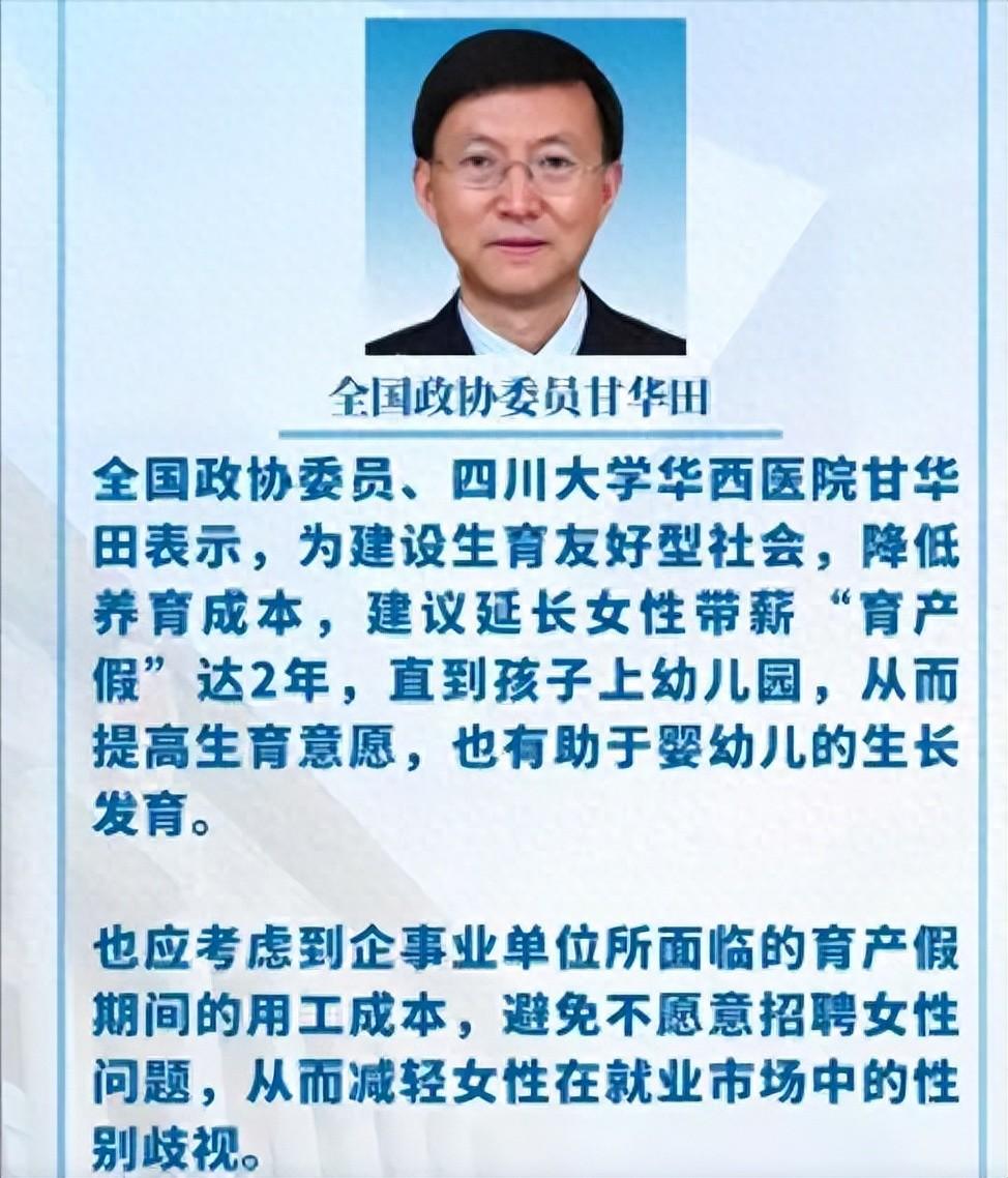 甘華田的建議還考慮到了企事業單位在育產假期間所面臨的用工成本問題。他認為,如果女性的育產假期間過長,企業可能不愿意招聘女性,從而導致性別歧視。為了避免這種情況的發生,他提出了延長女性帶薪“育產假”的建議。通過提供更長的帶薪假期,可以減輕企事業單位的用工負擔,促進性別平等和公平就業。