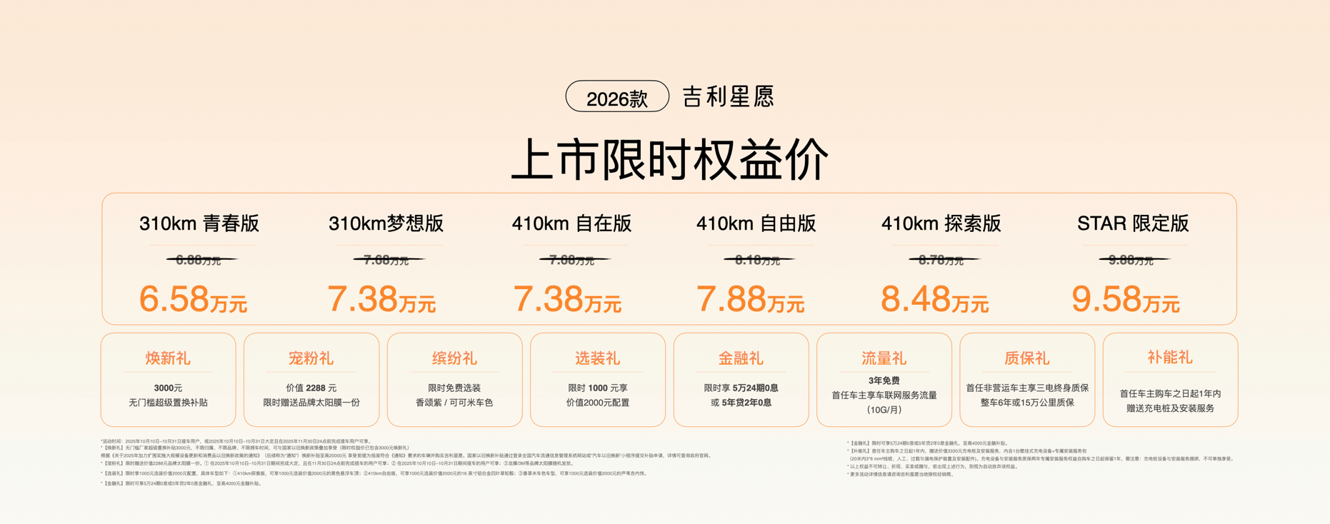 2025年是“智能吉利2025戰略”的收官之年,從“造老百姓買得起的好車”到“造每個人的智能精品車”,都是吉利的初心所在。截止今年9月,吉利銀河已經收獲了145萬用戶,成為中國新能源最快突破百萬銷量的品牌,也將在本月成為最快達成年銷百萬的新能源品牌。隨著2026款吉利星愿的上市,將助力星愿在累計銷量突破40萬輛、穩居全品類車型銷量冠軍的高基數上,進一步強化"現象級爆款"的市場號召力,驅動銀河品牌從市場的引領者,邁向未來出行生活方式的定義者。