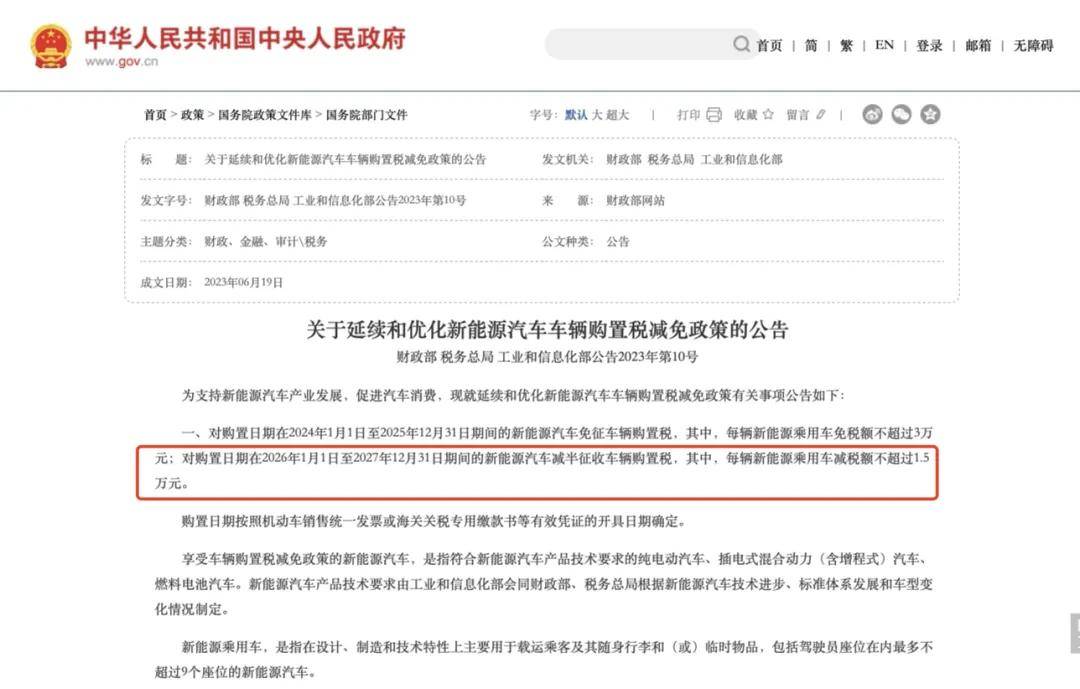 但是從2026年開始,新能源車享受的購置稅減免政策將從“免征”調整至“減半”,并且每輛車減免稅額不超過1.5萬元。