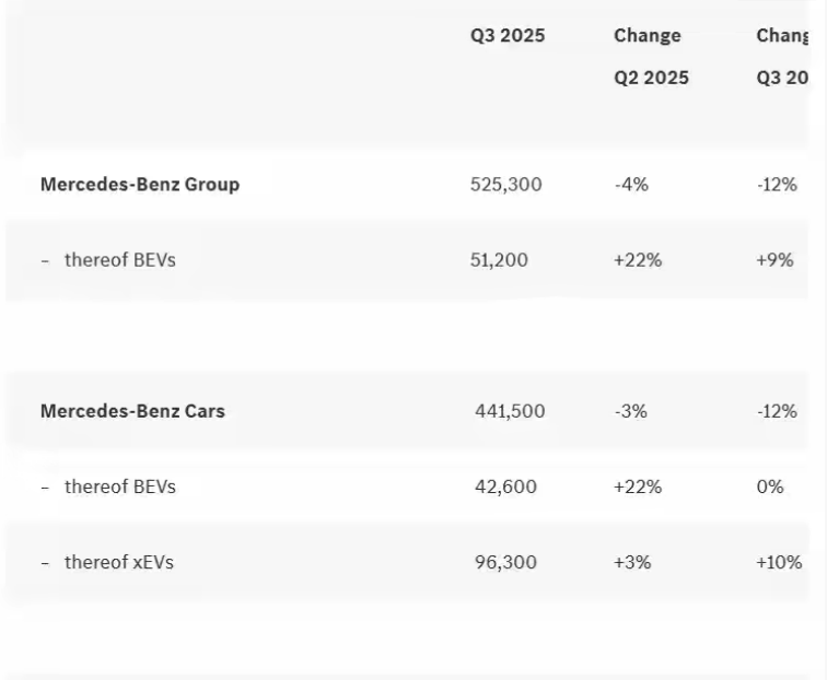 梅賽德斯-奔馳集團最新發布的2025年第三季度銷售數據顯示,公司全球銷量為52.53萬輛,較去年同期下降12%。=12%