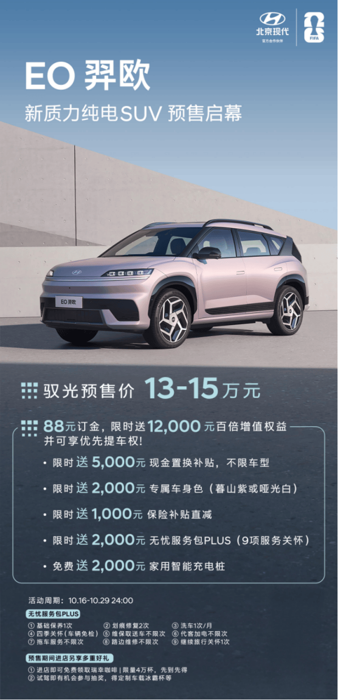 伴隨預(yù)售價公布,北京現(xiàn)代同步推出極具誠意的限時權(quán)益:支付88元訂金,即可限時獲贈12,000元百倍增值權(quán)益,并享受優(yōu)先提車權(quán)。該權(quán)益包含5000元現(xiàn)金置換補貼、2000元專屬車身色、1000元保險補貼、2000元無憂服務(wù)包PLUS及免費贈送2000元家用智能充電樁。