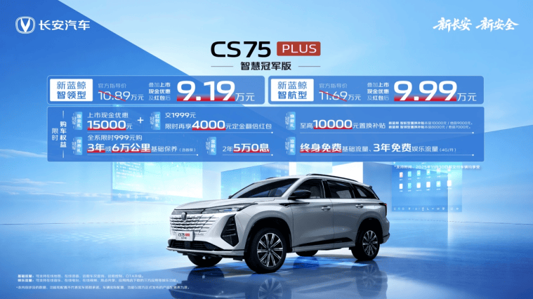 2025年10月23日,長(zhǎng)安汽車再次攪動(dòng)10萬(wàn)級(jí)SUV市場(chǎng)——長(zhǎng)安CS75PLUS智慧冠軍版正式上市!新車共推出兩款配置,疊加上市優(yōu)惠后限時(shí)價(jià)分別為9.19萬(wàn)元和9.99萬(wàn)元(官方指導(dǎo)價(jià)10.89萬(wàn)元、11.69萬(wàn)元),并同步帶來(lái)現(xiàn)金補(bǔ)貼、定金翻倍、0息金融、免費(fèi)保養(yǎng)、終身流量等多重購(gòu)車禮遇,活動(dòng)持續(xù)至11月30日。