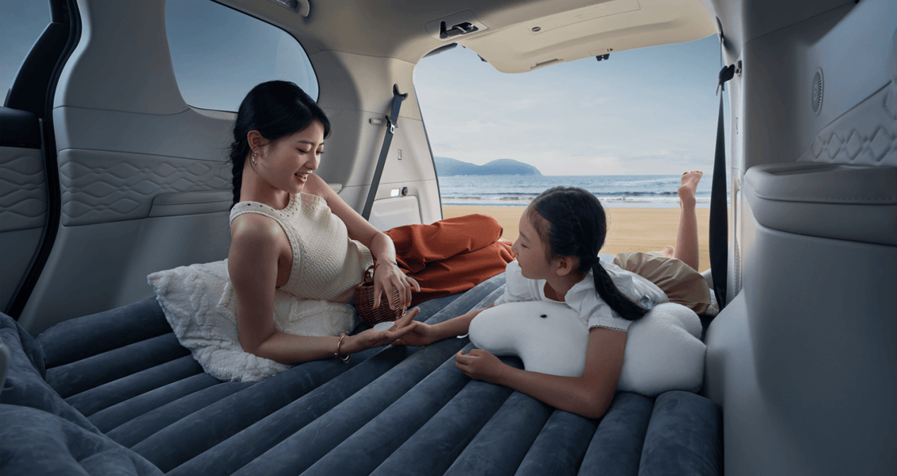 更狠的是同級唯一第三排四六比例下沉放平設計,與地板齊平,構造出移動下沉大平層,一鍵操作就能把后排變成1.8米純平的星空大床,孩子能在上面打滾玩耍,長途露營時爸媽也能躺平休息,甚至閑暇時也能小憩。