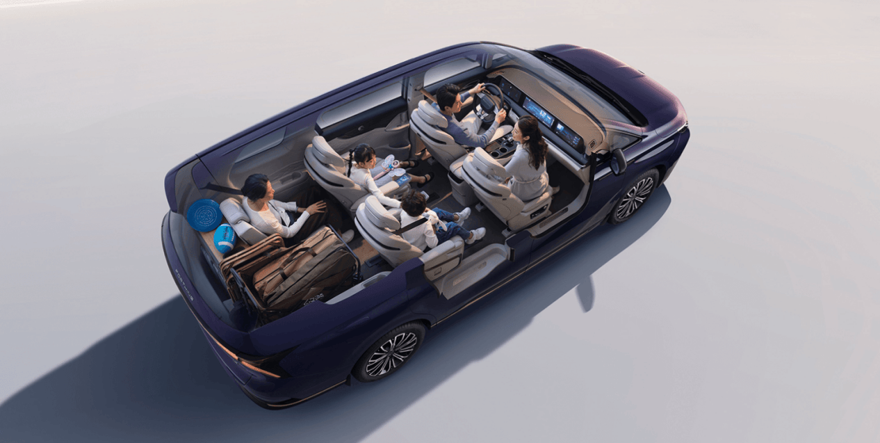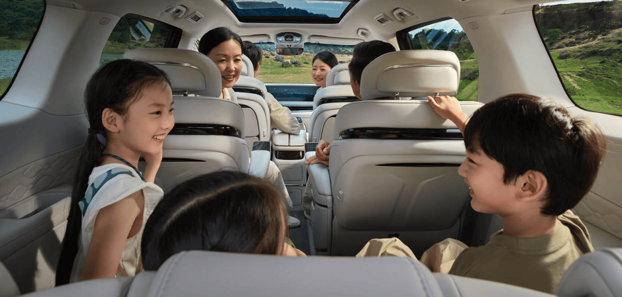 星海V9的車身尺寸達 5230×1920×1820mm,軸距 3018mm,內部空間足足 5.54㎡,還有同級最高的得房率,達85.2%,這意味著,第三排不再是“小板凳”,筆者切身試過第三排的空間,成年人坐進去頭部、腿部仍有寬裕空間,甚至比不少B級MPV的第三排還舒服。