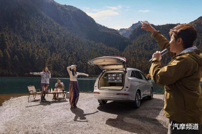 雙模影院:二排吸頂屏負責車內觀影,車頂投影儀+尾門下拉幕布組合,輕松打造“車內私人影院+車外觀影廣場”;