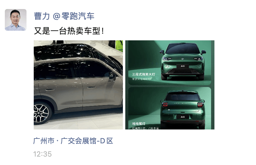 A10今天在廣州車展正式亮相后,零跑副總裁曹力在朋友圈寫道“又是一臺熱賣車型”。
