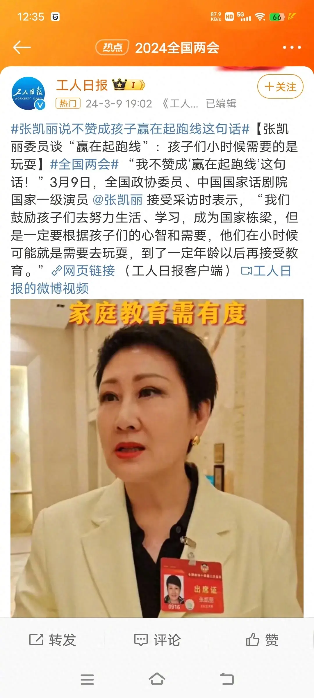 在全國(guó)兩會(huì)這一關(guān)乎國(guó)計(jì)民生的重要平臺(tái)上,全國(guó)政協(xié)委員、中國(guó)國(guó)家話劇院國(guó)家一級(jí)演員張凱麗女士擲地有聲地表達(dá)了她對(duì)于社會(huì)普遍存在的“贏在起跑線”觀念的深切反思與理性批判。3月9日,張凱麗在接受媒體采訪時(shí)明確表示:“我堅(jiān)決不贊成‘贏在起跑線’這句話。”她的觀點(diǎn)引起了廣泛的社會(huì)共鳴,也為我國(guó)兒童教育理念的探討帶來(lái)了新的思考維度。