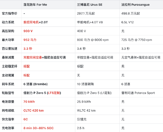 在超跑SUV市場,蓮花For Me展現了清晰的差異化定位。與法拉利Purosangue和蘭博基尼Urus相比,For Me不僅在價格上更具競爭力,更在技術路線上選擇了面向未來的插混方案。