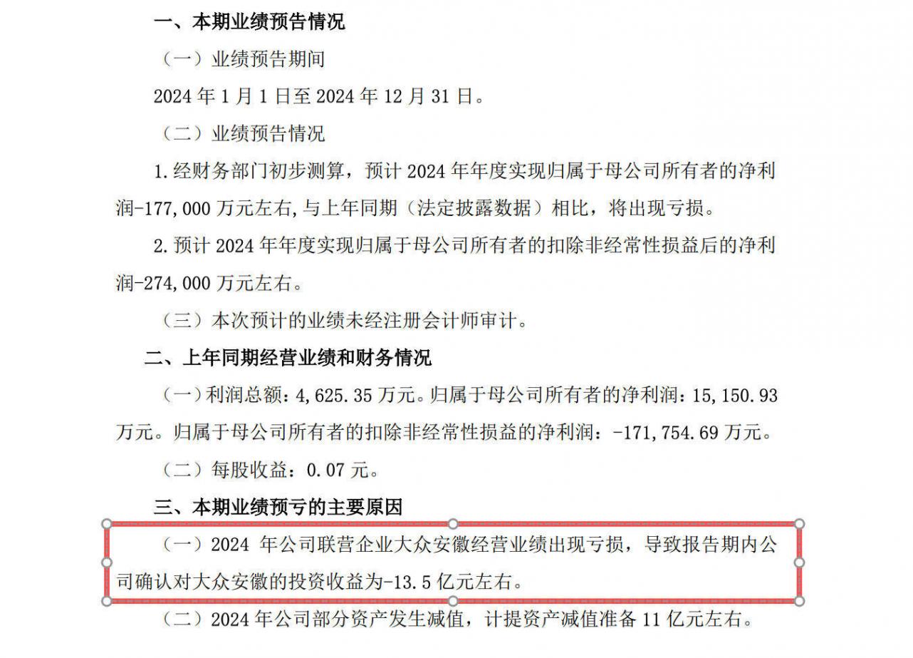 根據江淮汽車(600418.SH)2024年年度業績預虧公告,公司2024年年度由盈轉虧,虧損主要原因之一是2024年公司聯營企業大眾安徽經營業績出現虧損,導致報告期內公司確認對大眾安徽的投資收益為-13.5億元左右。