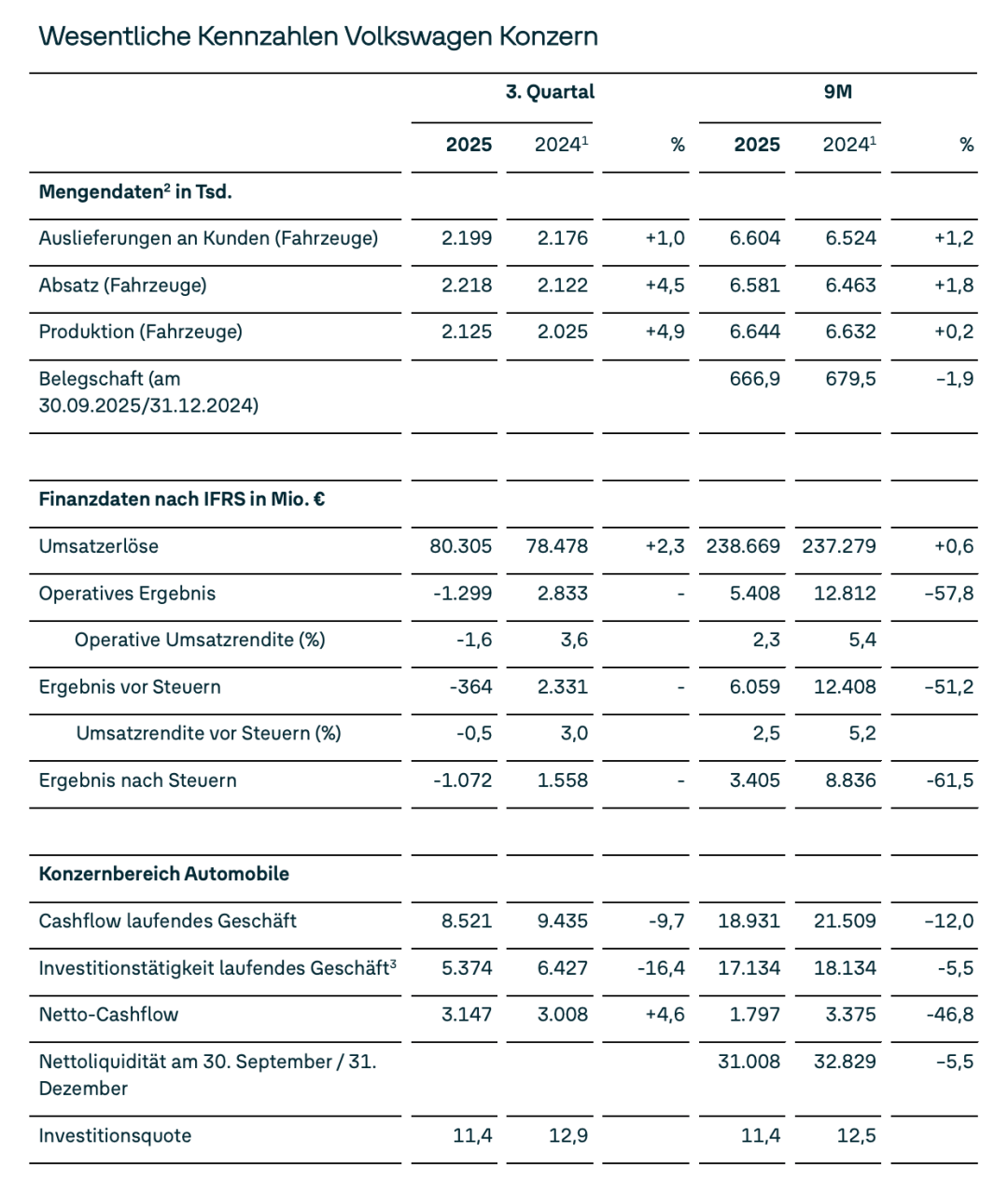 10月30日,大眾汽車集團(tuán)發(fā)布2025年第三季度財(cái)報(bào)顯示,2025年第三季度實(shí)現(xiàn)營(yíng)業(yè)收入803.05億歐元,同比增長(zhǎng)2.3%;營(yíng)業(yè)虧損12.99億歐元,上年同期營(yíng)業(yè)利潤(rùn)28.33億歐元;息稅前利潤(rùn)為虧損3.64億歐元,同期利潤(rùn)為23.31億歐元;稅后利潤(rùn)為虧損10.72億歐元,同期為15.58億歐元。從數(shù)據(jù)不難看出,雖然大眾汽車營(yíng)收實(shí)現(xiàn)增長(zhǎng),但是卻在盈利方面面臨巨大的嚴(yán)峻挑戰(zhàn)。