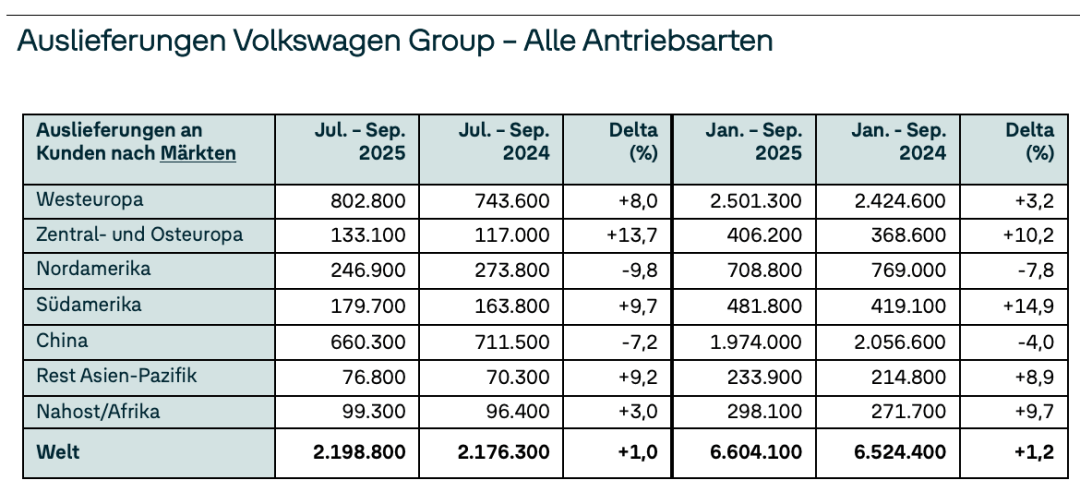 2025年第三季度,大眾汽車集團(tuán)共交付汽車219.9萬(wàn)輛,同比增長(zhǎng)1.0%。從增長(zhǎng)動(dòng)力來(lái)看,部分具體車型在全球市場(chǎng)表現(xiàn)出色,為交付量增長(zhǎng)做出了貢獻(xiàn)。不過(guò),這樣的增長(zhǎng)幅度在全球汽車市場(chǎng)快速發(fā)展的當(dāng)下,顯得有些不盡人意。中國(guó)作為大眾汽車的重要市場(chǎng),曾經(jīng)為其全球銷量增長(zhǎng)提供強(qiáng)大動(dòng)力,但如今情況卻不容樂觀。第三季度,大眾汽車在中國(guó)市場(chǎng)的銷量出現(xiàn)下滑,同比下滑7.2%,為66.03萬(wàn)輛。隨著中國(guó)自主品牌車企如比亞迪、奇瑞、吉利等的強(qiáng)勢(shì)崛起,市場(chǎng)競(jìng)爭(zhēng)異常激烈。自主品牌在新能源汽車領(lǐng)域憑借性價(jià)比優(yōu)勢(shì)、先進(jìn)的電池技術(shù)和智能化配置,迅速搶占市場(chǎng)份額。大眾汽車在面對(duì)這些競(jìng)爭(zhēng)對(duì)手時(shí),在產(chǎn)品價(jià)格、智能化水平等方面的優(yōu)勢(shì)不再明顯,導(dǎo)致其市場(chǎng)份額被逐步擠壓。