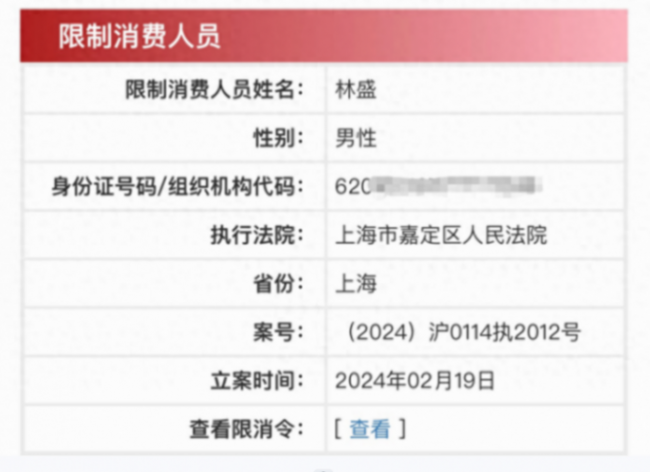 天眼查App顯示,林盛為鐘薛高食品(上海)有限公司法定代表人、執行董事兼總經理。案號為(2024)滬0114執2012號的執行案件,被執行人為鐘薛高食品(上海)有限公司,執行標的為818106元。