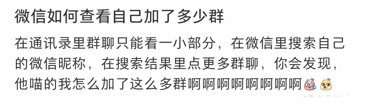在群聊列表頁面,你會看到微信已經為你準備好了一個統計數據。在頁面最上方,會顯示出你加入的群聊數量。你只需一目了然,就能知道自己加入了多少個群了!