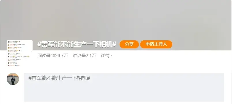 今天,#雷軍能不能生產一下相機#的話題登上熱搜,很多人希望小米能造“年輕人的第一臺相機”。
