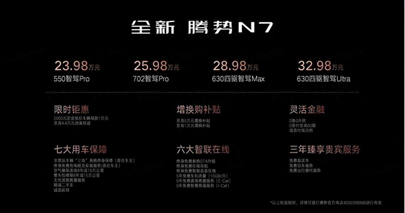 作為100萬內唯一智電融合的豪華性能電動SUV,全新騰勢N7豪華再進化,以全面領先同級的核心產品力和絕無僅有的誠意價格,打造出極具質價比的30萬級豪華車市場價值標桿,為多元用戶帶來了高品質出行的最優解。伴隨全新騰勢N7的到來,高端純電SUV市場格局將被重新改寫,智慧豪華出行體驗也將全面刷新,定不負年輕人和年輕家庭的智慧之選。不止滿足新用戶,在市場內卷愈演愈烈的背景下,騰勢汽車也為老用戶帶來了頂格的安心感,相當于0元換新的置換補貼,便是騰勢品牌回饋老用戶陪伴與信任的最大誠意。真誠、真心、懂用戶,你永遠可以相信騰勢汽車!