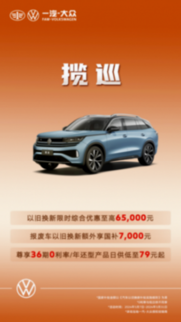 攬巡作為一款硬核大5座SUV,其外觀設計充滿了力量感,車身造型凌厲有氣勢,同時流暢柔美的車身線條又調和了硬朗外形的棱角感,讓車身腰線剛勁有力又不失優雅格調。而且攬巡搭載的是大眾EA 888發動機,最大馬力220 Ps,動力強勁,同時還搭載了4驅系統以及運動、經濟、標準、越野等駕駛模式,可根據實際使用情況自主調節,為駕乘者帶來更加舒適和便捷的駕駛體驗。目前,其以舊換新綜合優惠可有65000元,還能享受36期0利率等等,性價比很高。