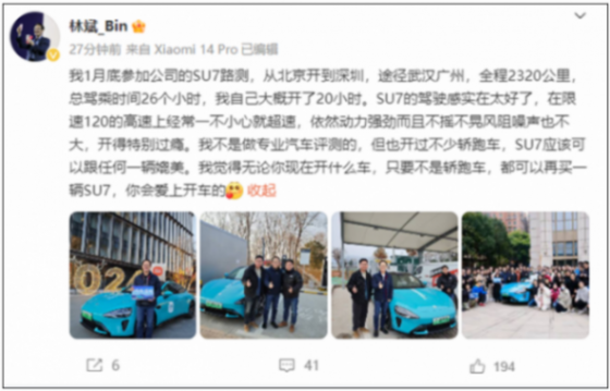 4月4日,小米聯合創始人林斌在社交媒體上更新了動態,發布了自己提車小米SU7的照片,并分享了駕駛體驗。林斌表示,他于1月底參加了小米SU7的路測,從北京開到深圳,途徑武漢廣州,全程2320公里,總駕乘時間26個小時,他大約開了20小時。